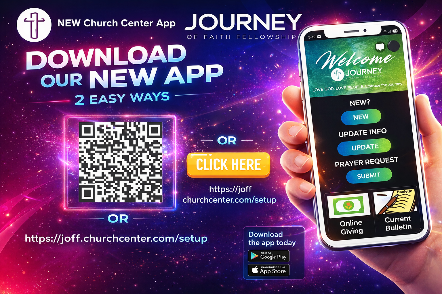 • Download the church app at joff.churchcenter.com or by using the phone tap cards on the back of the seats