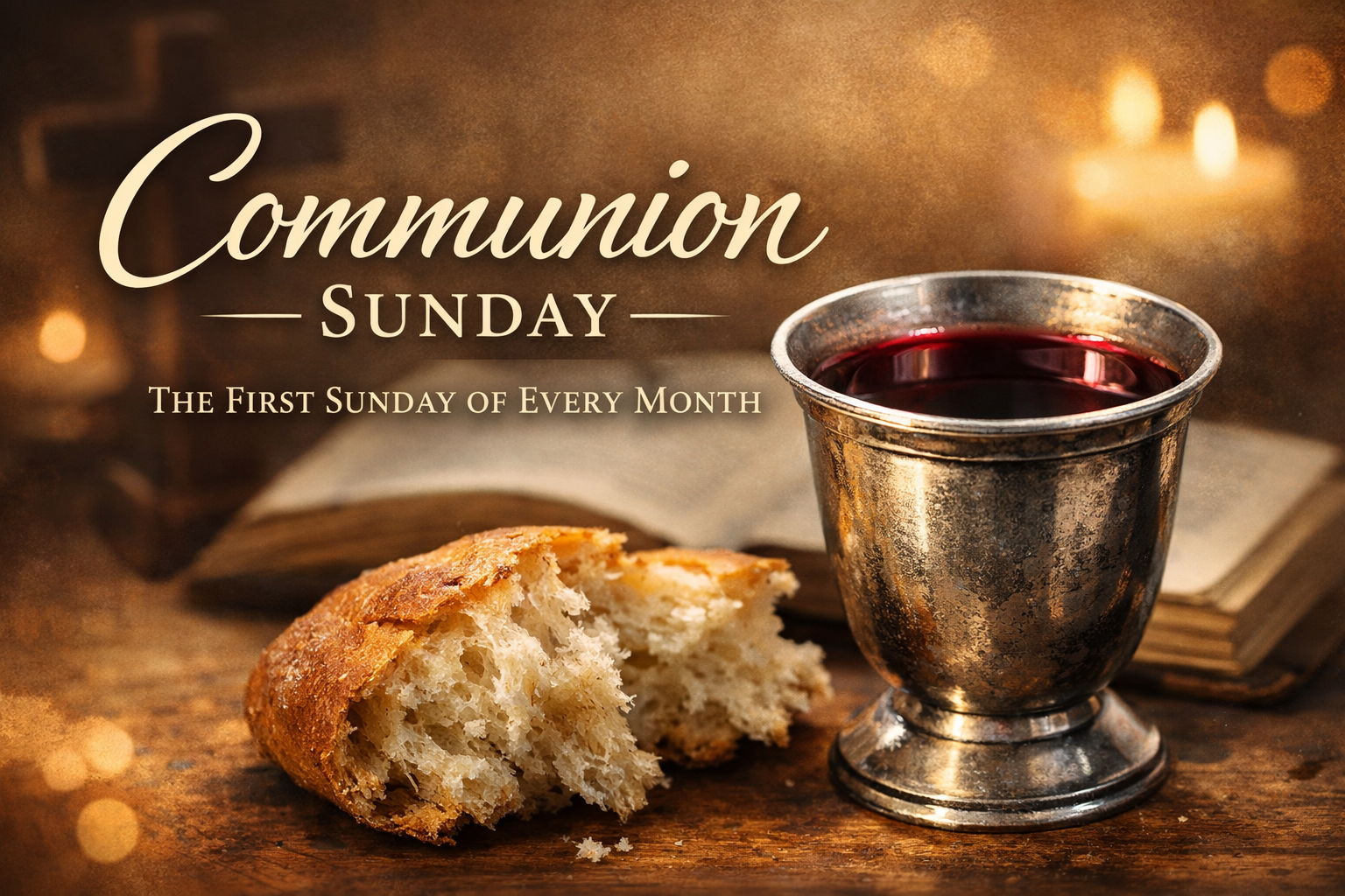 We share communion the First Sunday of the Month during Worship.